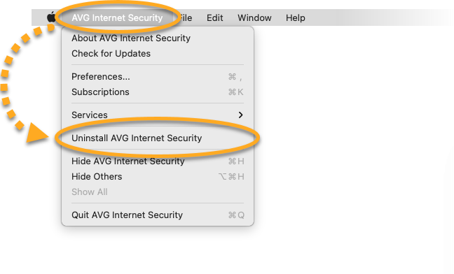 - Ensure the AVG Internet Security window is active, then click AVG Internet Security ▸ Uninstall AVG Internet Security on the left side of the Apple menu bar.