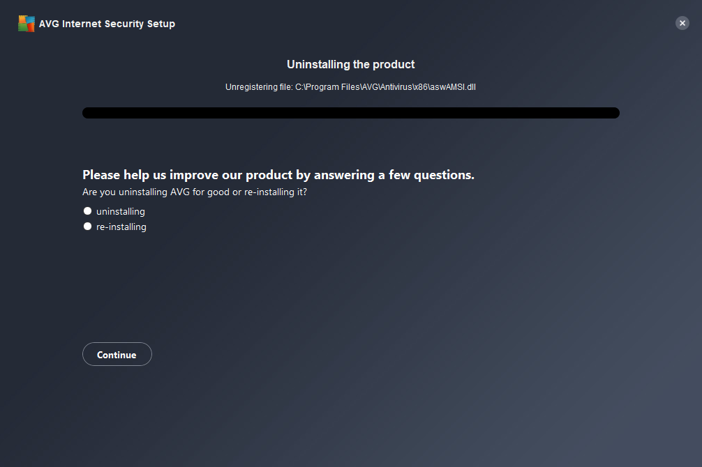 - Await while the Setup wizard removes AVG Internet Security from your PC.