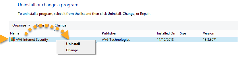 - Correct-click AVG Internet Security, then select Uninstall from the drop-down carte.